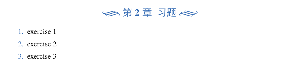 前面我们介绍了例题和练习两个环境,这里我们再加一个,章后习题(problemset)环境,用于在每一章结尾,显示本章的练习。使用方法如下